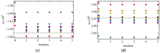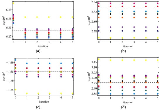 Convergence of coefficients αl (×100) in the case of BRDF (Equation (13)) with τR = 0.1, τR = 0.1. Different colors are 10 random realizations of 12 observations. Dashed lines—theoretical values. (a) α1; (b) α2; (c) α3; (d) α4.