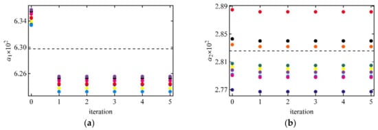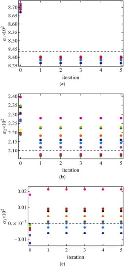 Numerical experiments below will use surface-reflected radiance L computed on the grid described in Section 2.3. Random selections of 12 and 60 geometries, i.e., values of {μ0,i, μi, φi}, were performed for each optical thickness, so that retrievals were performed on different sets of data. The purpose of this study is to test the developed algorithm, so the optimized selection of data samples suggested in study [] was not used. The final results of retrievals are summarized in Table 1 and Table 2. The iterative process of retrievals are shown in Figure 1, Figure 2 and Figure 3. As one can see from the figure’s zeroth iteration, Equation (8) provides good accuracy but it can be improved with the first iteration, Equation (9). The difference between first and second iterations can be hardly seen on the graphs. Within an accuracy of seven decimal figures, there is no difference between the second and all subsequent iterations. Therefore, for practical purposes zeroth and first iterations are enough for the process to converge.