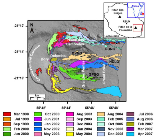 Piton de la Fournaise is a hotspot shield volcano located in the south-eastern part of La Réunion Island, Indian Ocean (Figure 1 inset). It presently hosts the Enclos Fouqué caldera (~13 × 9 km in size), where an active volcanic cone founded by two pit-craters (Bory crater to the west and Dolomieu crater to the east) is located inside (Figure 1). The Eastern Flank of Piton de la Fournaise, which is open to the sea, involves the Grandes Pentes and the Grand Brûlé areas (Figure 1). Being one of the most active basaltic volcanoes in the world, Piton de la Fournaise erupts frequently and produces significant lava flows. It erupted 25 times and emitted nearly 450 Mm3 of magma to the surface between March 1998 and April 2007, preceded by a six-years of quiescence [5,6,7]. The lava fields emplaced between March 1998 and April 2007 are illustrated in Figure 1. They have mainly covered the north-eastern, eastern, and south-eastern flanks of the volcano. Characteristics of these lava flows, including the geometric parameter (surface, volume, and flux), location and elevation, have been investigated and presented by Roult et al. [5]. Continuous ground displacements recorded at the GNSS stations located in these lava fields (Figure 1) have also been reported by Peltier et al. [7] and Staudacher Peltier [8]. However, few analyses focusing on the long-term post-emplacement displacement in lava fields at a large spatial extent have yet been performed.