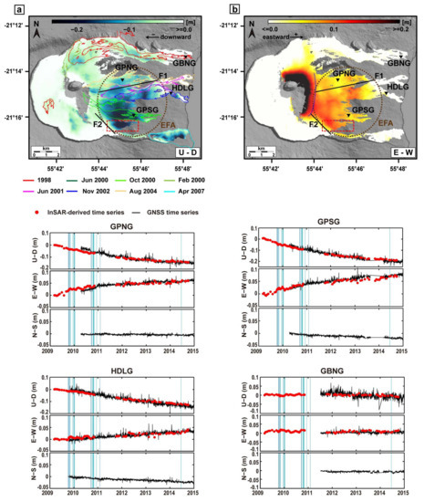 - Chen, Y.; Remy, D.; Froger, J.-L.; Peltier, A.; Villeneuve, N.; Darrozes, J.; Perfettini, H.; Bonvalot, S. Long-term ground displacement observations using InSAR and GNSS at Piton de la Fournaise volcano between 2009 and 2014. Remote Sens. Environ. 2017, 194, 230–247. [Google Scholar] [CrossRef]