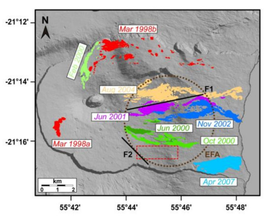 Nine lava flow fields were eventually extracted, including the Mar 1998a–b, Feb 2000, June 2000, Oct 2000, June 2001, Nov 2002, Aug 2004, and Apr 2007 lava fields (named after their date of emplacements; Figure 3).