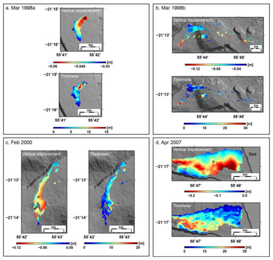 Cumulative U-D displacement and thickness maps for four lava fields located outside the Eastern Flank Area (EFA). (a) Mar 1998a lava field, (b) Mar 1998b lava field, (c) Feb 2000 lava field, and (d) Apr 2007 lava field. Black circles indicate the selected points with 10 m of thickness for time series plots in Figure 6.