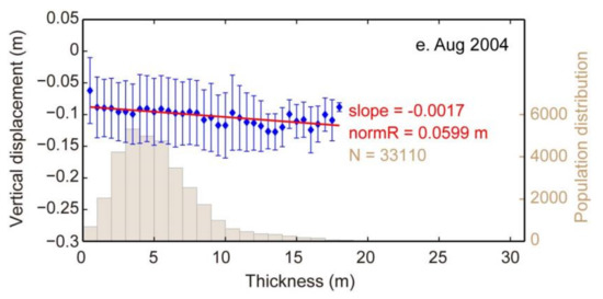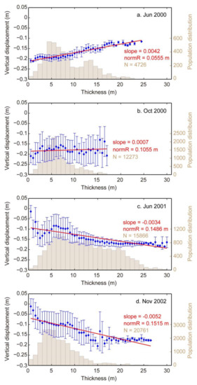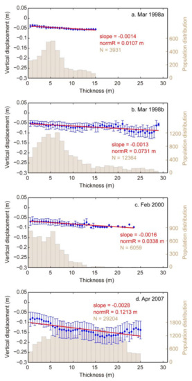 The cumulative vertical displacement during the 2009–2014 period and the lava thickness for each selected lava flow emplaced outside the EFA are shown in Figure 4. All lava flow fields outside the EFA show a trend of downward movement with varying degrees of magnitudes. From a visual inspection, large subsidence occurs generally in and adjacent to thick areas (Figure 4). To quantitatively characterize the relationship between the subsidence and the thickness of the lava flow fields, we divided coherent pixels into several small bins according to thickness (1 m unit). Displacements in each bin are statistically analyzed and plotted in function with thickness in Figure 5, on the background of the population distribution histogram. The Mar 1998a lava thickness ranges from one meter to fifteen meters, giving a slight cumulative subsidence of ~0.03 to ~0.06 m during the ~5.5 years period. The Mar 1998b lava field (up to 30 m thick) subsides cumulatively ~0.02 to ~0.12 m. The Feb 2000 lava (up to 20 m thick) subsides ~0.02 to ~0.1 m in total. The Apr 2007 lava field (thickness up to 25 m) shows an overall downward displacement of ~0.02 to ~0.25 m. Figure 5 shows that the subsidence magnitude increases with the raising of flow thickness (a positive correlation) following clear linear laws in all cases. We fitted the correlation using linear functions and the best fits are presented in red lines with norm of residuals, marked alongside, indicating good linear fits (Figure 5). The low values of norms of residuals (~0.01 m, ~0.07 m, ~0.03 m, and ~0.12 m for the Mar 1998a, Mar 1998b, Feb 2000, and Apr 2007 lava fields, respectively) confirm the linear relationship between subsidence and thickness in the selected lava fields outside the EFA, though one order of magnitude larger norm of residuals was obtained from the Apr 2007 lava field. The absolute subsidence-thickness (m/m) slopes of four lava flow fields (0.0014, 0.0013, 0.0016 and 0.0028 for the Mar 1998a, Mar 1998b, Feb 2000 and Apr 2007 lava fields, respectively) show that the magnitude of subsidence occurring in one meter thick lava increases with the decrease of lava age. The younger Apr 2007 lava subsides ~0.0028 m per meter (thickness) during the 2009–2014 period (Figure 5d), which is about twice larger than the magnitude of subsidence occurring in the 10 years older lava flow fields (the Mar 1988a-b lava fields; Figure 5a,b). The Mar 1998a lava field (Figure 5a) exhibits an absolute subsidence-thickness slope of 0.0014, approximate to that of the Mar 1998b lava field that emplaced in the same year (0.0013; Figure 5b) and a bit smaller than that of the Feb 2000 lava field that emplaced two years later (0.0016; Figure 5c).