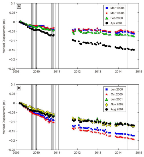 Temporal behavior of vertical displacement in lava fields located (a) inside and (b) outside the Eastern Flank Area (EFA). Light grey areas and black vertical lines represent the timing of eruptions and intrusions, respectively, which occurred in the study period (refer to caption of Figure 2 for timing). It is worth noting that at a certain point of time, the subsidence–age relation in Figure 6 cannot signify the subsidence–age relation of lava fields in general since the plot is based on time series observed at one point for each lava field.