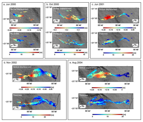 Cumulative U-D displacement and thickness maps for five lava fields located in the Eastern Flank Area (EFA). (a) June 2000 lava field, (b) Oct 2000 lava field, (c) June 2001 lava field, (d) Nov 2002 lava field, and (e) Aug 2004 lava field. Black circles indicate the selected points with 10 m of thickness for time series plots in Figure 6.