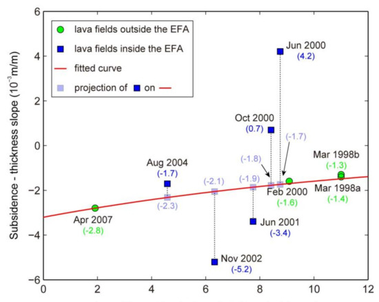 The portion of subsidence (per meter of thickness) due to post-lava emplacement processes in lava fields inside the EFA is expected to drop on the fitted curve (as shown by the transparent blue squares with approximated subsidence-thickness slopes in brackets in Figure 9). The discrepancies between the observed (blue squares) and the approximated (transparent blue squares) values reveal that the effects produced by other potential processes on lava fields inside the EFA vary spatially from north to south. The significant discrepancies of the June 2000, Oct 2000, June 2001, and Nov 2002 lava fields suggest that the potential processes might have accounted for a larger portion of the observed signals rather than post-lava emplacement processes. The two lava fields of 2000 located in the south, especially, display inversed subsidence-thickness slopes (subsidence decreasing with an increase of thickness) with respect to others. This suggests the potential processes could have played a dominant role in the pattern of the observed displacement affecting the 2000 lava fields. In particular, the areas covered by relatively thinner lava show a higher sensitivity in the accumulation of displacement in response to such potential processes. The Aug 2004 lava field located in the north, however, presents less discrepancy (close to the fitted curve; Figure 9) and reveals a relatively slighter effect from the potential processes. Based on this exponential law, we estimated that the contribution of post-emplacement lava flow subsidence to the subsidence observed inside the EFA could range from ~22% (in the June 2000 lava field) to ~79% (in the Aug 2004 lava field). In other words, the other processes could contribute up to ~78% of the subsidence. In comparison with the rough estimate of ~34% contributed by other processes derived by Chen et al. [23], the estimate of ~78% from this study should draw more attention, since this large portion of flank motion triggered by unknown processes could be hazardous.