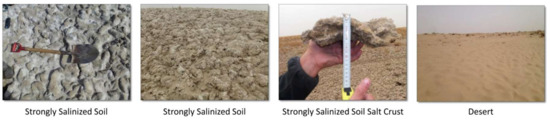 Field campaigns were conducted from 22 April to 7 May 2015. A total of 95 field survey sites were selected for soil sampling and investigation (Figure 1C), covering different ranges of land-cover and land-use (LCLU) and soil characteristics. Among them, 65 sampling points were within the PALSAR-2 image of our study area. At every site of a regular grid of 15 m × 15 m plots, five samples were taken from the topsoil (0~20 cm). The field investigation focused on collecting ground reference data (GRD) for training and validation samples plus different LCLU classes where the field samples were collected and a corresponding photo library of different LCLU classes was established over the study area (Figure 2). The GRD were recorded for the patches of salinized soils, along with their environmental contexts, e.g., co-existing vegetation, LCLU, vegetation type, fraction of vegetation, and average ground water depth in each spot. The soil samples were air-dried and sieved through two mm sieves, and soil salt concentration (i.e., total soluble salt) was measured in a laboratory and subsequently, corresponding analysis was carried out. Different degrees of salinization (i.e., highly, moderately, and slightly salinized soil) and corresponding land cover types were defined according to top soil salt concentration along with other features such as vegetation coverage, type, and ground water table (Table 3).