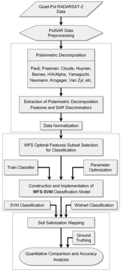 This study developed a method that fully utilizes the intrinsic merit of polarimetric decomposition, optimal feature subset selection (wrapper feature selector, WFS), and support vector machine (SVM) algorithms for the classification and extraction of salinized soils using quad-polarized PALSAR-2 images. Multiple polarimetric decomposition methods (Pauli, Freeman, Barnes, Holm, Cloude, Huynen, Yamaguchi, VanZyl, Krogager, Touzi, Neumann, H/A/Alpha) were integrated to extract polarimetric parameters and SAR discriminators related to the physically scattering mechanisms of soil salinity. The WFS that uses genetic algorithms was adopted to select and provide the best feature subset to implement SVM classification; a cross-validation method was employed to identify the optimum classification parameters and obtain an optimal SVM classification model. A WFS-SVM classification model was developed and further optimized based on the optimal match of polarimetric features and optimum classification parameters.