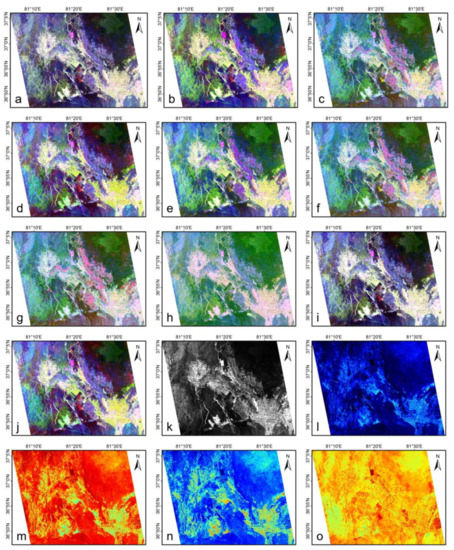 RGB composition images of different polarimetric decompositions and SAR discriminators including Pauli decomposition (a); Barnes2 decomposition (b); Cloude decomposition (c); Freeman3 decomposition (d); H/A/Alpha decomposition (e); Holm2 decomposition (f); Huynen decomposition (g); Krogager decomposition (h); VanZyl3 decomposition (i); Yamaguchi4 decomposition (j); Span (k); Pedestal height (l); Polarization fraction (m); Radar vegetation index (n); and DERD (o).