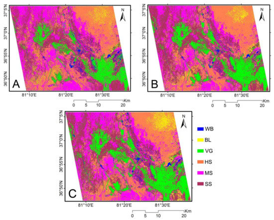 Comparison of different classification results. (A) Wishart supervised classification; (B) SVM classification; and (C) Proposed WFS-SVM classification. WB, BL, VG, HS, MS, and SS represent the water body, barren land, vegetation, highly salinized soil, moderately salinized soil, and slightly salinized soil, respectively.