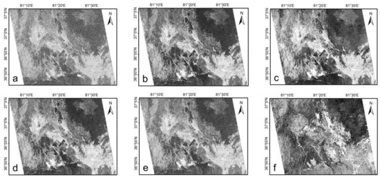 Polarized feature elements showing speckle noise. (a) Krog_Kh; (b) Cloude_T33; (c) H/A/a_T33; (d) Hol2_T33; (e) Huy_T33, (f) Bar2_T11.