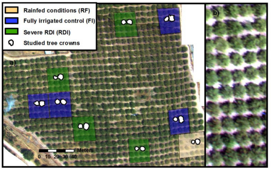 Overview of the almond orchard experimental site imaged by the hyperspectral sensor, showing the four replicates of the irrigated treatments and the rainfed condition plot (a). The central almond trees (in white) used to collect leaf measurements are shown. A detail view is displayed in (b).
