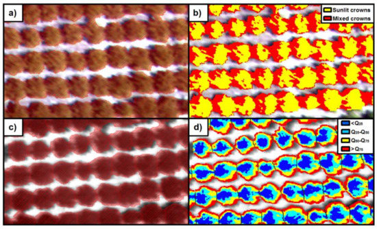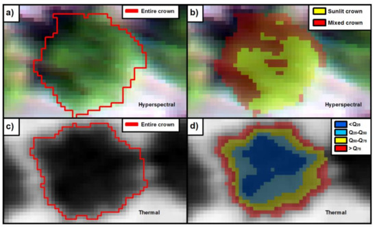 View of the entire crowns (in red with stripes) retrieved using automatic object-based crown detection applied to the imagery acquired with the Hyperspec VNIR (a) and thermal FLIR SC655 (c) cameras. The sunlit crowns (in yellow) and mixed crowns (in red) extracted from the hyperspectral imagery are shown in (b). The temperature segmentations based on quartile methods using thermal imagery are shown in (d).