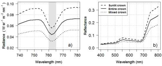 Radiance spectra in W·sr−1·m−2·nm−1 (a) and the corresponding reflectance spectra (b) for sunlit, mixed and entire crown targets retrieved from the high-resolution hyperspectral imagery during the second flight. The displayed spectra correspond to a tree crown under severe RDI. The vertical grey region in (a) shows the O2-A atmospheric oxygen absorption band.