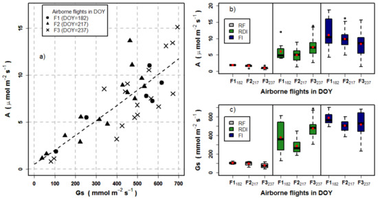 Scatter plot obtained between field assimilation rate (A; μmol·m−2·s−1) and stomatal conductance (Gs; in·mmol·m−2·s−1) for each flight date (F1–F3) (a). The boxplots show the A (b) and Gs (c) variability registered on rainfed (RF), severe regulated deficit irrigation (RDI) and full irrigation (FI) for each flight date (F1–F3). In the boxplots, the average values are shown with a red point. The black line within the box is the median, and the top and bottom of the box is the 75th and 25th quartile, respectively. The whiskers represent the upper and the lower limits based on the difference with the interquartile ranges (Q ± 1.5 × IQR). The outliers represented as asterisk correspond to values out of upper and lower limits.
