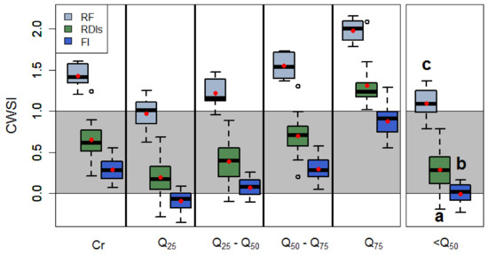 Box plot showing the airborne-quantified Crop Water Stress Index (CWSI) from entire crowns (Cr), the quartile classes separated using the 25th, 50th and 75th percentiles and the aggregated quartile classes (Q25 and Q25–Q50) for the water regimes of the experiment. RF, RDI and FI correspond to rainfed, severe regulated deficit irrigation and full irrigation, respectively. The grey shading corresponds to the theoretical CWSI limits between 0 and 1. Average values are shown with a red point. In the box plots, the black line within the box is the median, the top and bottom of the box is the 75th and 25th quartile respectively. The whiskers represent the upper and lower limits based on the difference with the interquartile ranges (Q ± 1.5 × IQR). The outliers represented as circles, correspond to values out of upper and lower limits. Treatments sharing the same letter were not significantly different in Tukey’s HSD post-hoc test (p-value < 0.0005).