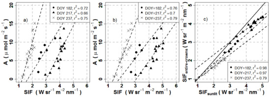 Relationships found on single dates between leaf net assimilation rate and airborne chlorophyll fluorescence (SIF) for entire tree crowns (a) and sunlit tree crowns (b). Relationships between SIF extracted from entire tree crowns and sunlit tree crowns (c) for single dates.