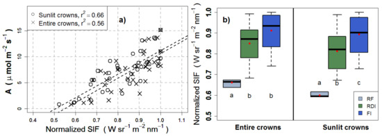 Relationships found between leaf assimilation and normalized airborne-quantified chlorophyll fluorescence for entire and pure sunlit crowns (a). Box plot of normalized SIF retrieved from entire crowns and pure sunlit crowns for the water stress regimes explored (b). The mean value is represented with a red point. For each segmentation, treatments sharing the same letter were not significantly different in Tukey’s HSD post-hoc test (p-value < 0.05).