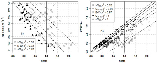 Relationships found between leaf stomatal conductance (Gs) and the CWSI by extracting pixels from entire crowns (E-Cr), pixels below the middle quartile (<Q50), and pixels in the upper quartile (>Q75) for all flight dates (a). Relationships between CWSI pixels extracted from the middle quartile class (<Q50) and all quartile-crown and entire tree crown segmentations explored (b). Solid black line represents the line 1:1, and dashed lines are fit lines for the studied quartile masks and entire crown mask.