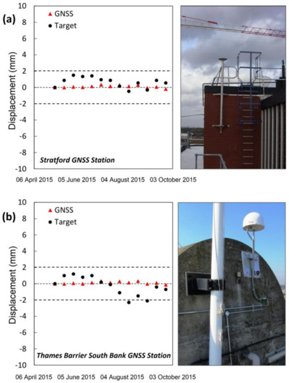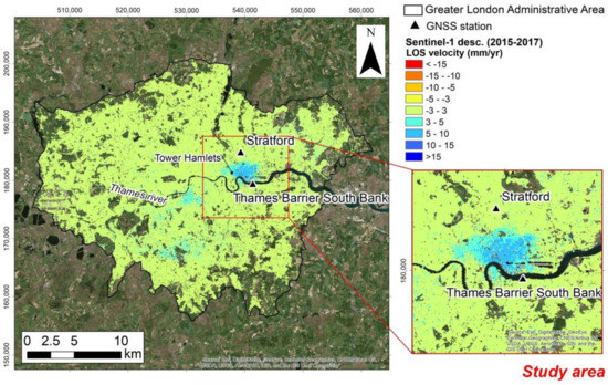 Furthermore, the measurements acquired by two GNSS stations located in London, and available through the British Isles Continuous GNSS Facility (http://www.bigf.ac.uk/), have been exploited (see the location in Figure 2) to obtain a comparison of the displacement time series and the average velocity using independent data. Firstly, LOS displacements TS and average velocities were projected along the vertical direction, by assuming that the displacement is essentially vertical [25,26]. This estimation was done dividing the LOS measurements by the cosine of the incidence angle.
