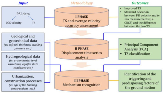 In this section, the procedure to analyze uplift phenomena in urban areas by exploiting the new Sentinel-1 data is presented refining the one discussed in Bonì et al. (2016) [30] for subsidence studies. The procedure consists of three main phases (Figure 3). In the first phase, the displacement time series (TS) and the average velocity accuracy assessment is performed. In the second phase, different statistical tests are applied in order to find the spatio-temporal pattern of the principal components of movement, and the kinematic model of the targets. Finally, the third step consists of the mechanism recognition of the ground motion areas. Therefore, the integration of satellite data with geological, geotechnical, hydrogeological, urbanization and construction processes data is considered in order to investigate the causes of ground motion processes. The phases of the methodology are described in detail in the following subparagraphs.