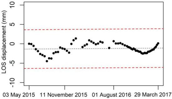 Average displacement time series (TS) of the targets characterized by coherence higher than 0.9 and LOS velocity in the range ±0.5 mm/year. The black dotted line represents the regression line of the average TS whereas the red ones are the upper and lower threshold line.