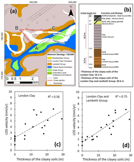 (a) Location of the boreholes used to estimate the thickness of the clayey soils. The cross sections (red line) are also reported; (b) Example of the procedure applied to estimate the thickness of the clayey soils of the London Clay and by computing the sum of the thickness of the clayey soils of the London Clay and Lambeth Group; (c) Comparison of the LOS velocity estimates in the period 2015–2017 with the thickness of clayey soils of the London clay using the boreholes information; (d) Comparison of the LOS velocity estimates in the period 2015–2017 with total thickness of clayey lithologies of the boreholes considering the London Clay and the Lambeth Group. Based upon the 1:50,000 bedrock geology, with the permission of the British Geological Survey. All rights reserved.