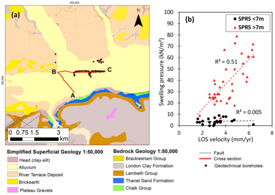 (a) Location of the geotechnical boreholes; (b) Comparison of the LOS velocity estimates in the period 2015–2017 with the swelling pressure of the superficial (depth lower than 7 m) and deeper layers (higher than 7 m). Simplified Superficial Geology of Greater London modified from the DiGMapGB50, the Digital Geological Map of Great Britain at the 1:50,000 scale and bedrock geology at the 1:50,000 scale, with the permission of the British Geological Survey. All rights reserved.