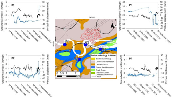 Groundwater level changes between January 2015 and January 2016 reported by the Environment Agency [41] record a rise of 1 m in the uplift zone (Figure 10). Furthermore, by cross-comparison of the available piezometric level measurements with the deformation rates, a direct correlation is evident (Figure 10) as previously reported [28].