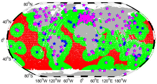 Based on GNSS dual-frequency code and phase measurements from globally distributed International GNSS Service (IGS) tracking stations (Figure 1), it is possible to invert Global Ionosphere Maps [24,25,26]. GNSS TEC used in this study is obtained from GIMs of the Center for Orbit Determination in Europe (CODE), the Jet Propulsion Laboratory (JPL), and the Polytechnic University of Catalonia (UPC) for 2009. The approaches used by these three analysis centers to provide global ionosphere products differ, but their databases are almost the same. CODE’s GIM is developed by a 15 × 15 spherical harmonic function model with a 2-h resolution [27,28]. JPL’s technique is based on a linear composition of bi-cubic spline interpolation within 1280 spherical triangular tiles that tessellate the ionosphere, corresponding to 642 vertices [29]. UPC independently computes the TEC with a two-layer tomographic model and an interpolation scheme, with the help of the IRI model to improve the UPC products [19,26]. Besides, Nykiel et al. [30] presented an orthogonal projection technique for mapping TEC, which allows us to visualize ionospheric irregularities. In GIMs computation, several error sources can limit the ionosphere model accuracy: the spherical symmetry assumption, when the elevation-dependent mapping function is used to convert slant TEC (sTEC) to vertical TEC (vTEC); the ionosphere layer height, used to describe the vTEC distributions; the lack of GNSS data over wide areas, such as the sea and southern mid-high latitude areas; and the differential code bias for GNSS satellites and receivers.