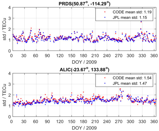 In this study, GIM-derived vTEC performance was validated with GPS-based vTEC at the ionospheric pierce point (IPP) location. The ionospheric slant TEC (sTEC) can be directly extracted from the raw dual-frequency measurements by removing the satellite DCB and receiver DCB [37], which are released by CODE and JPL IONEX file. Then, we can obtain the GPS-based vTEC at IPP through applying the mapping function. The GIM-derived vTEC at IPP can be extracted through a spatial interpolation scheme, and linear time interpolation between two consecutive GIMs. Here, two IGS sites (PRDS and ALIC) in 2009 were selected as an example to evaluate the GIM-derived interpolation vTEC performance. To reduce the error from the mapping function and multipath, the elevation cutoff was selected as 30°. Taking the vTEC extracted from the GPS dual-frequency measurements as the reference value, we calculated the standard deviation (std) of the GIM-derived vTEC interpolation value from CODE and JPL. Figure 2 shows the statistical result; it can be found that the accuracy is lowest within 2 TECu (the mean std at PRDS for CODE and JPL are 1.19 TECu and 1.15 TECu, respectively; similarly, the mean std at ALIC for CODE and JPL is 1.54 TECu and 1.47 TECu, respectively), suggesting that the GIM-based interpolation vTEC from CODE and JPL is consistent with that of the GPS dual-frequency measurements. Therefore, it is believed that GIMs-derived vTEC from CODE and JPL has high accuracy within 2 TECu. Meanwhile, as the stations are densely distributed in the interested zone of our paper, the determination of the GIMs-derived vTEC should not be greatly affected by the interpolation scheme.