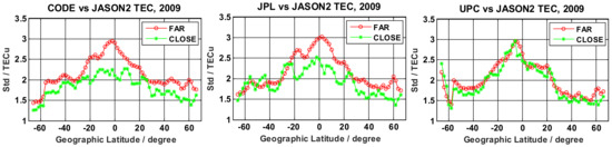 Std of the residuals regarding JASON2 vTEC for two cases (CLOSE to and FAR from IGS sites, respectively) in 2009, as a function of the geographic latitude.