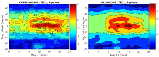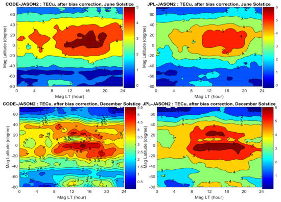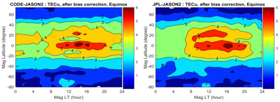 After subtracting the background systematic bias, we obtain Figure 6. As expected, the values are all positive, and the PEC distribution is in good agreement with the general plasmaspheric distribution investigated by other measurements and methods [2,11,12,16]. Hence, our proposed method for extracting PEC is suitable and reliable, and the systematic bias correction is reasonable. Furthermore, the PEC for CODE-JASON2 has the same distribution trend and magnitude as for JPL-JASON2; both are mainly distributed in annular area at mid-low latitudes, and show almost the same daytime peaks in equatorial regions for the corresponding season. This also indicates that the systematic bias correction is relatively accurate and reasonable.