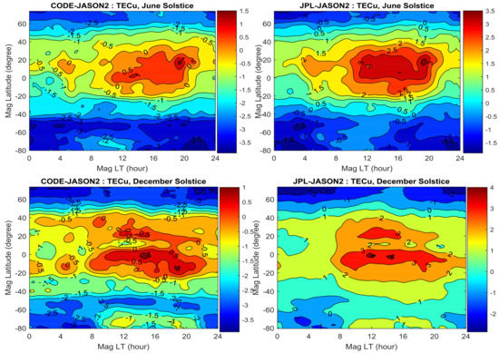 Seasonal average of plasmasphere maps for CODE-JASON2 and JPL-JASON2 in 2009, after subtracting the systematic bias, mapped against geomagnetic latitudes and local time coordinates.