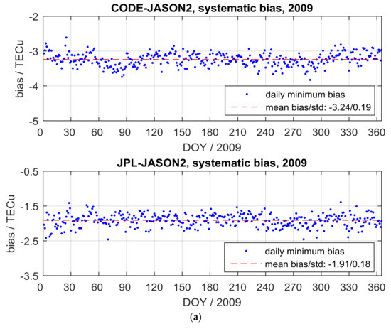 It appears that systematic biases exist, and make normal plasmasphere values shift to the values of Figure 4. Considering that GNSS satellite orbit altitude (~20,000 km) is significantly higher than that of T/J satellites (~1336 km), GNSS-derived vTEC should be larger due to the additional contribution of the plasmasphere above the T/J satellite orbital altitude. However, the difference maps (Figure 4) not only show positive values (at middle and low latitudes) but also negative values (mainly at high latitudes). From the comparison above, we propose that a systematic bias may exist in CODE GIM minus JASON2 vTEC, as well as another systematic bias in JPL GIM minus JASON2. In principle, this type of systematic bias could be generated by an overestimation of T/J vTEC (T/J calibration error) or an underestimation of GNSS-derived vTEC (GIM mis-modeling). However, according to the GIM-based interpolation vTEC accuracy, as well as the smaller Std (close to the IGS sites in Figure 3), we believe that the GNSS-derived vTEC (with abundant IGS sites nearby) from GIM has very high accuracy, thereby indicating that the systematic bias mainly arises from T/J (see details in Discussion and Conclusion).
