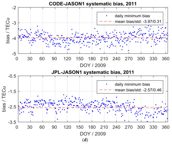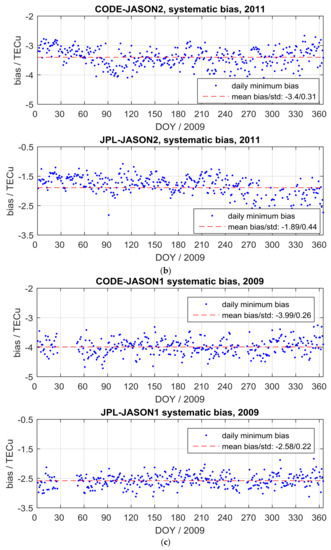 To investigate the stability of the daily bias, we calculated the systematic bias in 2009 and 2011 (Figure 5a–d). It is found that the daily bias for JASON2 in 2009 is very stable, and the magnitude of the daily systematic bias value in 2011 is consistent with that in 2009. In addition, the daily systematic bias for JASON1 in 2011 is in agreement with that in 2009 (Figure 5a,b).Therefore, the systematic bias in 2009 (low solar condition) and 2011 (high solar condition) is stable, and it does not vary with solar activity. It should also be noted that the systematic bias differs for JASON2 and JASON1, suggesting that we should carefully use the systematic bias from JASON1 and JASON2 to extract PEC. The average values of daily systematic bias over each season were removed to extract PEC and obtain the plasmaspheric contribution above the T/J satellite altitude.