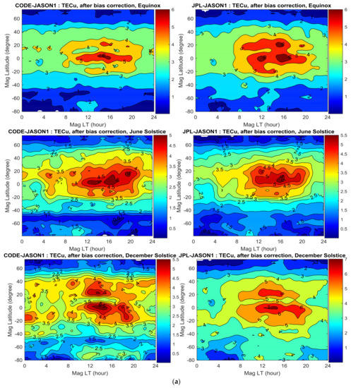 (a) Same as Figure 6, but for CODE-JASON1 and JPL-JASON1. (b) Seasonal average of plasmasphere maps for JPL–JASON1 and JPL-JASON2 in 2011, after subtracting the systematic bias, mapped against geomagnetic latitudes and local time coordinates.