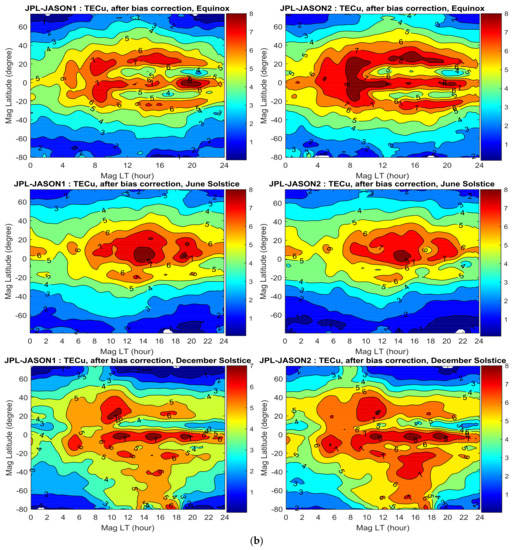 Similar approaches have also been used for plasmaspheric studies using T/J satellites. Jee et al. [15] compared GPS vTEC and T/J vTEC for 1998–2009, and reported a positive relative TEC difference (i.e., GPS vTEC > T/J vTEC) in the PEC contribution to the ionosphere, which was largest in the early morning sector (up to 100%). However, many studies have found that T/J vTEC has a positive systematic bias of 2–5 TECu above real ionospheric TEC values when compared to other independent sources (i.e., T/J vTEC > GPS vTEC) [17,18,19,20,21,22,23]. This is paradoxical because GPS satellite altitude (~20,000 km) is higher than that of T/J satellites (~1336 km); thus, GPS vTEC should be larger than T/J vTEC due to it including the plasmasphere contribution above the T/J satellite orbital altitude. Chelton et al. [17] pointed out that the relative TEC bias indicates a systematic error in the T/J sea state bias (SSB) correction, which is an empirical model with limited accuracy, and SSB assembles corrections for the sum of the electromagnetic (EM) bias, skewness bias and tracker bias. Meza et al. [20] performed a comparison of GPS-based la plata ionospheric model (LPIM) with T/J estimates during quiet geomagnetic days in 1997. They concluded that systematic biases for T/J-LPIM were 2.5–3.0 TECu, and larger during equinox than during solstice periods. Brunini et al. [22] believed that the positive bias was mainly caused by a combination of LPIM underestimation (at low latitudes) and T/J SSB correction (at mid-latitudes). Azpilicueta and Brunini [23] reported the constant bias on TOPEX vTEC was caused by miscomputing the ionospheric correction.