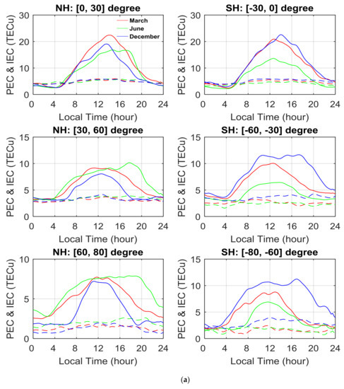 Furthermore, PEC magnitude is much smaller than IEC magnitude, whereas the dispersion between them is significantly smaller during the night than during the day: PEC can sometimes exceed IEC for a few hours around sunrise at low latitudes. Hence, to specifically explore the effect of PEC on TEC (i.e., IEC = TEC − PEC), the PEC percentage contribution was defined as the contribution of PEC to GNSS-derived TEC (PEC/TEC, in %).