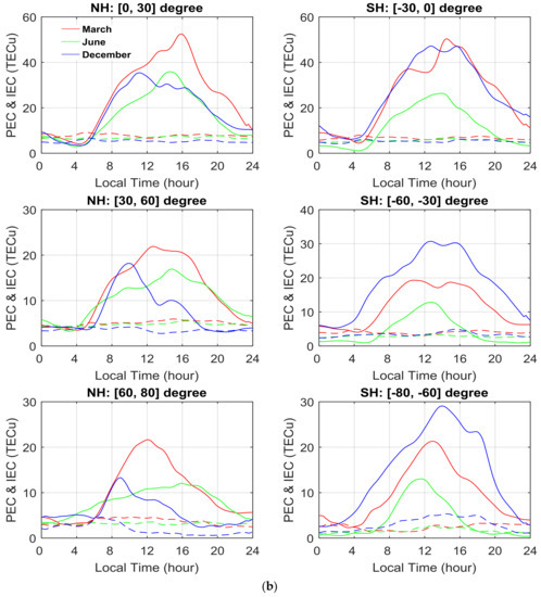 As shown in Figure 6 and Figure 7a,b, PEC shows clear latitude and local time variations: PEC is mainly distributed in a banded region within ±40° of the equator, with the maximum value occurring at low latitudes and reducing with increasing latitude. PEC exhibits diurnal variation, with higher values during the day (peaking values around 12:00–20:00 LT) than during the night (minimum values around 02:00–05:00 LT). This kind of PEC diurnal variation pattern is related to strong coupling between the plasmasphere and the ionosphere [12,38], Seasonal variations of the plasmasphere are weaker than those in the ionosphere; the PEC maximum seasonal averaged value is ~6 TECu in 2009, and ~8 TECu in 2011. Moreover, during the June and December solstice, PEC values at mid-high latitudes are higher in the summer hemisphere than in the winter hemisphere, which is similar to the hemispheric asymmetry observed in the ionosphere. The LT variation of mean electron contents in the ionosphere–plasmasphere system during the solstices and the spring equinox are represented in Figure 8a,b. The IEC was obtained from the GIM-derived vTEC, minus the PEC processed by bias correction (i.e., IEC = TEC − PEC). The mean values of IEC and PEC for low, middle and high geomagnetic latitudes in each hemisphere were calculated every fifteen minutes over three periods, namely, March equinox, June solstice, and December solstice.
