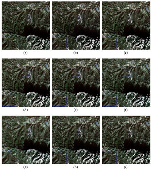 Visual results for Pléiades dataset (4 bands, ) obtained by different pan-sharpening methods. (a) Referential high resolution multispectral image, (b) PCA method, (c) GS method, (d) HPF method, (e) MTFGLP method, (f) PHLP method, (g) NIHS method, (h) RKHS method, (i) Proposed method.