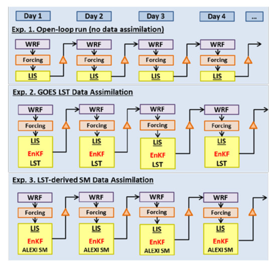 To assess the impact of assimilating either land surface temperature observations or LST-based soil moisture on regional numerical weather prediction, a set of data assimilation experiments is carried out based on the LIS and WRF semi-coupling framework, including: (1) an open-loop run with no data assimilation, (2) an LST DA run that directly assimilates LST observations and (3) an SM DA run that assimilate SM derived from LST using the ALEXI model. In all of these experiments, WRF provides atmospheric forcing data to LIS; LIS runs the land surface process simulation and data assimilation using the same version of the Noah LSM as WRF; and then, LIS returns the updated land state variables and fluxes back to WRF to initialize its forecasts.