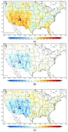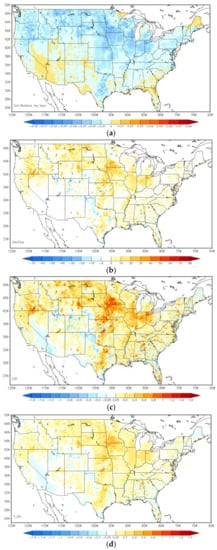 Figure 4 is the same as Figure 3, but for the differences between the direct LST data assimilation run and the open-loop run. A substantial rise in surface and 2-m temperature has seen over the Northern Plains and the Midwest regions, while 2-m relative humidity has fallen by as much as 5% correspondingly over those regions. Additionally, temperature predictions slightly cool down in small regions at the border among California, Nevada and Arizona, as well as the central area in Texas. The direct LST assimilation presents higher surface temperature forecasts over the Southern Mountain and Plains regions, which is similar to the impacts from ALEXI SM DA, but of a much smaller magnitude.