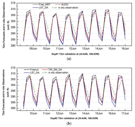 Comparison of 2-m temperature between forecasts and in situ observations over the validation site in New Mexico (34.64N, 106.83W) for Day 1 forecast (a) and Day 2 forecast (b).