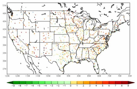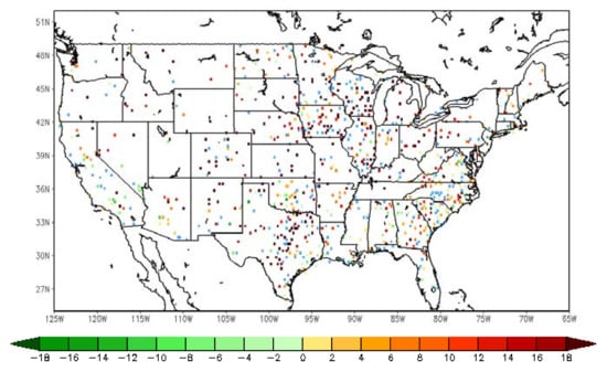 Similarly to the analysis of the near surface temperature, the spatial distribution of the difference in RMSE of the 2-m RH forecasts is given here with more than 900 validation sites over the CONUS domain in Figure 9. The RMSE difference between the LST-based SM DA (direct LST DA) run and the WRF open-loop run is shown on the left (right) in Figure 9. The inter-comparison between assimilations of LST-based SM and direct LST is shown in Figure 10. The differences of over around 200 ground sites out of a total of 970 are not statistically significant at the 95% confidence interval, which are marked in blue color in Figure 9 and Figure 10. The positive impact with the assimilation of land surface temperature is gained over the majority of the validation sites, while slight degradation can be detected in a small amount of sites along the eastern coast area. Furthermore, the magnitude of improvement with LST-based SM DA is larger than that with direct LST DA by roughly 1.70% on average.