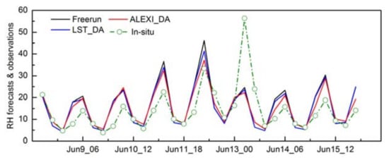 The potential impact of assimilating LST in the NWP model is then assessed by validating the near surface forecast of atmospheric humidity. Figure 8 exhibits the comparison of relative humidity (RH) forecasts from the WRF open-loop run and two assimilation runs, along with the observations from the ground validation site in New Mexico (106.83W, 34.64N) over the period of 8–12 June 2012. The open-loop run presents a consistently positive bias compared to the in situ measurements. There is a dramatic jump to as high as almost 60% in relative humidity on 13 June in the in situ record, but it is not shown in any model runs. The region in New Mexico and Texas was under a severe drought during that period, which makes the extremely high value questionable. It may be a noisy signal caused by unknown observational reasons, so the data on 13 June are excluded in the following analysis. Except for that day, the time-series comparison suggests that the assimilation of LST information (both direct LST and LST-based SM) is able to reduce the positive bias. Compared to the mean bias from the open-loop run (3.07%), the direct LST assimilation can reduce bias to 2.62%, while the LST-based ALEXI SM assimilation run lowers the bias to 2.53%. The largest impact occurred on 12 June, when the bias of the open-loop run is reduced by 4.85% with directly assimilating LST and an additional 9.10% reduction by assimilating LST information into the WRF model by converting to SM signals (ALEXI SM).