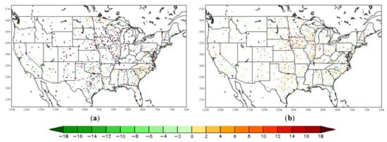 The difference in the RMSE of T2m forecasts between the WRF open-loop run and DA runs; open-loop run minus TIR SM DA run (a); open-loop run minus LST DA run (b); warm (cool) color means added (degraded) value; sites marked blue did not exhibit a statistically-significant difference (43 stations for TIR SM DA and open-loop; 41 stations for LST DA and open-loop; 986 stations in total).