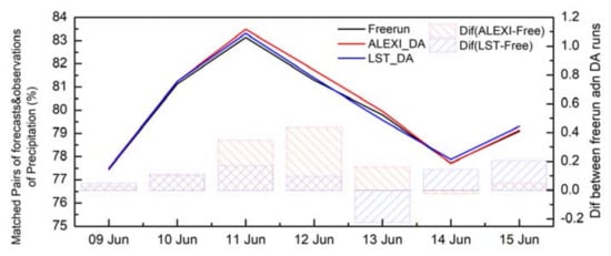 Lastly, the impact of the assimilation of LST information on precipitation is examined by comparing WRF runs with the NCEP National Stage IV Precipitation dataset. The percentage of matched pairs of 24-h accumulated precipitation between the Stage IV precipitation dataset and WRF forecasts is shown in Figure 11. First of all, the impact on precipitation by assimilation of land surface temperature is not as strong as the above-analyzed near surface forecasts (e.g., temperature or humidity). However, the validation results still illustrate subtle improvement in precipitation forecast from LST assimilation runs by showing a relatively higher percentage of matched pairs of forecasts and ground observations, averaged over the CONUS domain. Better agreement with ground observations can be detected throughout the validation period, except one day on 13 June when direct LST assimilation shows slight degradation.