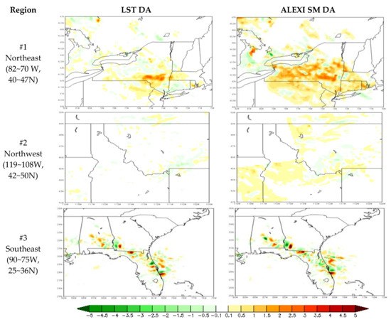 The accuracy of model forecasts (with and without DA) is further quantitatively analyzed by comparing them with the National Stage IV Precipitation dataset pixel by pixel. We focus on three major rainfall events across CONUS on 10 June 2012 in this analysis. The RMSE is calculated for each of the WRF runs (open-loop run and two DA runs) separately using Stage IV precipitation as the “true” observations. The RMSE differences between DA runs and the open-loop run (open-loop run minus DA runs) are then plotted and shown in Figure 12 to illustrate the added or degraded value by data assimilations. The RMSE differences between direct LST DA (LST_based SM DA) and the open-loop run are shown on the left (right) panel in Figure 12, with warm (cool) color meaning improvement (degradation). The maps of RMSE differences demonstrate that both assimilation approaches improve the precipitation forecasts by showing less RMSE over the majority of the rainfall region, compared to the open-loop run, especially over Region #1 and #2. Evidently, LST-based SM DA outperforms the direct LST approach, presenting added value to precipitation forecasts over larger areas and to a larger extent over the northeast (Region #1) and northwest regions (Region #2). Two types of LST assimilation are comparable over rainfall events in the southeast region (Region #3), with mixed added and degraded values after assimilation.