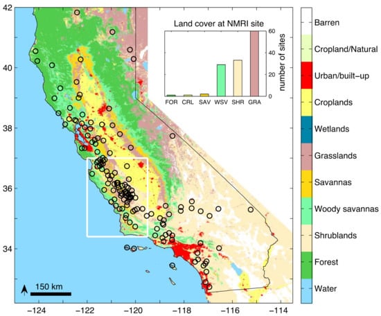 Location of the 146 GPS stations used in this study. The background represents the MODIS IGBP land cover classification. The white rectangle is the region chosen for the regional-average analysis. The inset shows the number of Normalized Microwave Reflection Index (NMRI) sites by land cover type (GRA grassland, SHR shrubland, WSV woody savanna, SAV savanna, CRP cropland, FOR forest).